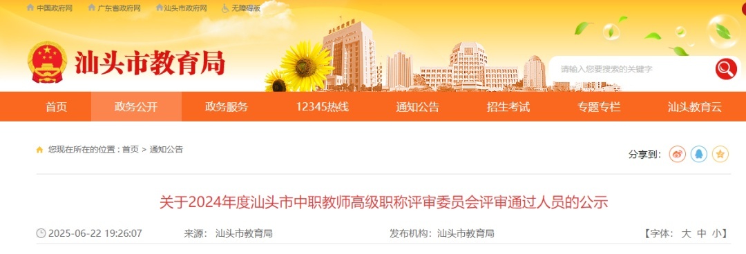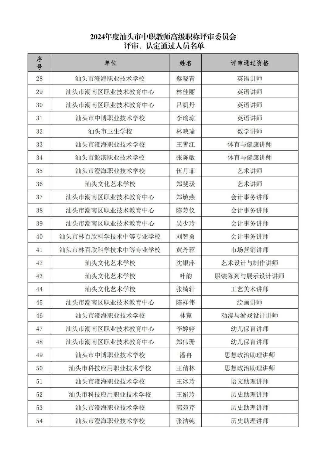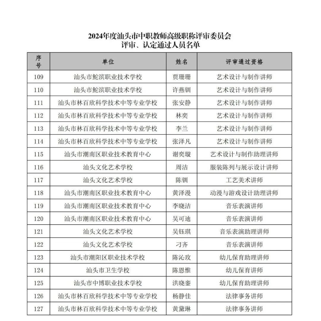 根据《广东省职称评审管理服务实施办法及配套规定的通知》(粤人社规﹝2020﹞33号)和《汕头市教育局关于做好2024年度汕头市中职教师职称评审工作的通知》(汕市教人〔2024〕73号)等文件要求,现对汕头市中职教师高级职称评审委员会评审通过的2024年度高、中、初级人员和认定通过的2024年度中、初级人员(详见附件名单)进行公示。