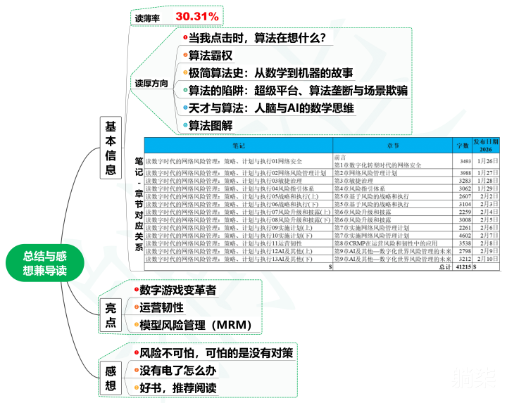 笔记章节字数发布日期 2026读数字时代的网络风险管理:策略、计划与执行01网络安全前言第1章数字化转型时代的网络安全34931月26日读数字时代的网络风险管理:策略、计划与执行02网络风险管理计划第2章网络风险管理计划39881月27日读数字时代的网络风险管理:策略、计划与执行03敏捷治理第3章敏捷治理32831月28日读数字时代的网络风险管理:策略、计划与执行04风险指引体系第4章风险指引体系30621月29日读数字时代的网络风险管理:策略、计划与执行05战略和执行(上)第5章基于风险的战略和执行26072月2日读数字时代的网络风险管理:策略、计划与执行06战略和执行(下)第5章基于风险的战略和执行31042月3日读数字时代的网络风险管理:策略、计划与执行07风险升级和披露(上)第6章风险升级和披露22592月4日读数字时代的网络风险管理:策略、计划与执行08风险升级和披露(下)第6章风险升级和披露30082月5日读数字时代的网络风险管理:策略、计划与执行09实施计划(上)第7章实施网络风险管理计划22612月6日读数字时代的网络风险管理:策略、计划与执行10实施计划(下)第7章实施网络风险管理计划46022月7日读数字时代的网络风险管理:策略、计划与执行11运营韧性第8章CRMP在运营风险和韧性中的应用35382月8日读数字时代的网络风险管理:策略、计划与执行12AI及其他(上)第9章AI及其他—数字化世界风险管理的未来27982月9日读数字时代的网络风险管理:策略、计划与执行13AI及其他(下)第9章AI及其他—数字化世界风险管理的未来32122月10日$总计41215$